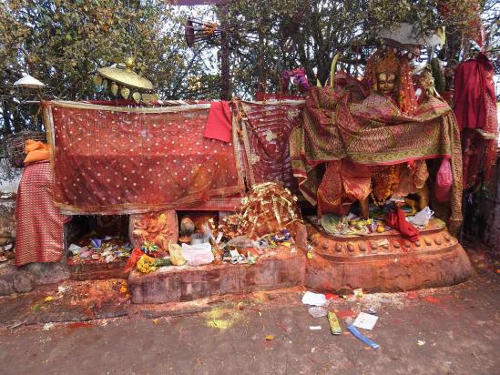 On atteint la porte d'entrée du sanctuaire. Il ne reste plus qu'à gravir quelques marches (les dernières...) pour se retrouver sur le carreau du temple et pouvoir aller saluer la déesse Pathibhara (2h, 3795m, eau, possibilité de camp côté S du sommet, C). Ici, les codes bouddhistes et principalement hindouistes se mélangent. Les pèlerins se croisent dans la bonne humeur et le respect de l'autre (ils sont tous venus, et pour nombre d'entre eux de l'Inde toute proche, pour soumettre leurs désirs à la déesse). La couleur rouge sang hindouiste se marie avec les drapeaux bouddhistes multicolores. On trouve sur le site un espace de sacrifice d'animaux (certains viennent ici avec une chèvre...).