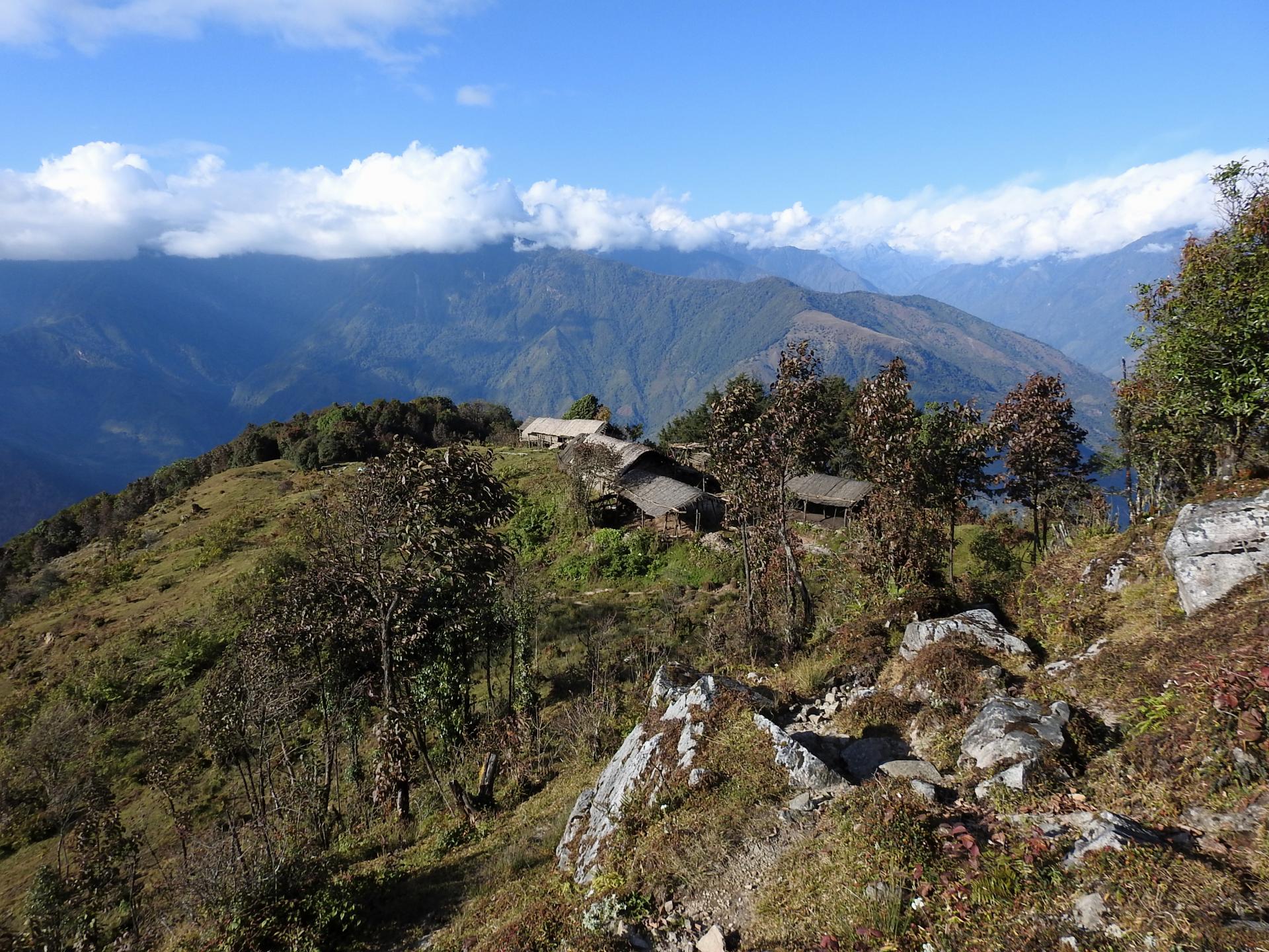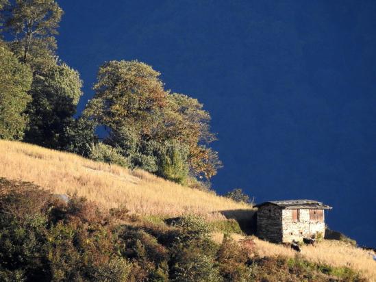Diaporama La descente reprend de plus belle après cet intermède nocturne, aussi pentue, aussi glissante et peut-être légèrement plus humide le matin. On évolue en forte pente le long d'une friche avec le Jannu, le Kangchenjunga et les Kabru à l'horizon. On dépasse une drôle de cabane construite sur pilotis dont l'une des extrémités repose bien sur le rebord de la crête alors que l'autre est appuyée dans le vide sur deux frêles piliers de bois de cinq à six mètres de haut (25mn, 2025m). Au-delà, on trouve un chemin qui s'élargit un peu mais surtout bien viabilisé par de larges marches arrêtées par des rondins de bois : confortable comme descente après ce que l'on a vécu... Cette descente nous aura réservé quelques dizaines de surprises, heureuses ou moins heureuses ! En tout cas, exceptionnelle en tout point. On descend vers le village d'Oitangu composé de quelques maisons colorées.