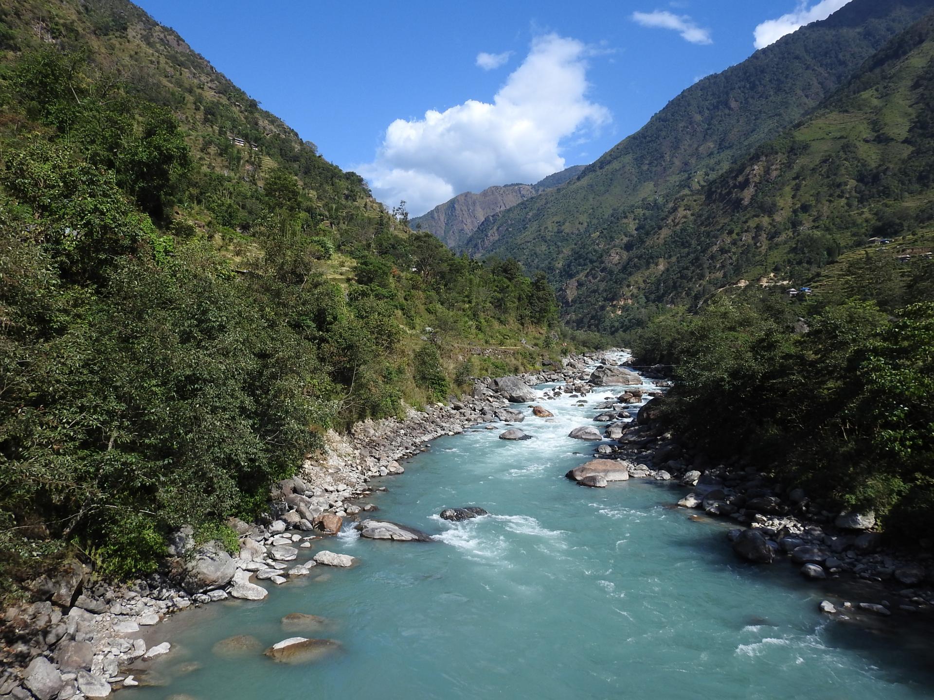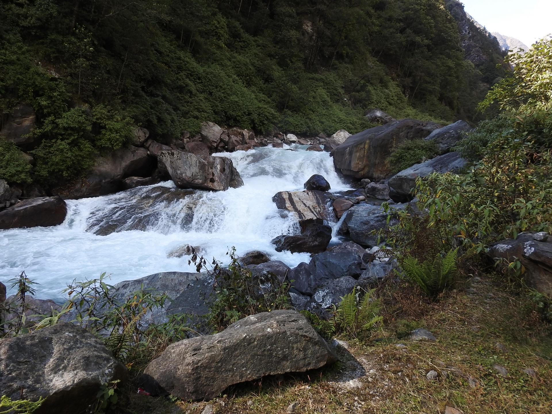 On se retrouve RG où l'on prend un peu de hauteur en zigzags serrés, une centaine de mètres, pour aller traverser un thalweg et ensuite évoluer en up / down dans une forêt peu dense. On passe à proximité d'une grotte qui peut servir d'abri de fortune et on poursuit à hauteur de la rivière dans une gorge relativement étroite où les arbres ont déployé des troncs altiers pour que les branches et les feuilles puissent aller toucher quelques rayons de soleil. La montée se poursuit alors que l'on traverse l'étage de végétation des bambous et autres calumets (55mn, 2460m). On est au lieu-dit "Malingue" et, à l'arrière, revoici le sommet de Pathibhara qui "pointe son nez" à l'horizon. On traverse une cascade (5mn, 2455m) puis on franchit le large thalweg de la Ramsyan khola sur un pont de bois au-dessus duquel a été construit un abri (15mn, 2425m, eau, pas de possibilité de campement aux alentours mais seulement une petite dizaine de places sous l'abri ouvert et encore en se serrant un peu). En face, de l'autre côté du sillon tracé par la Tamur khola, on peut voir un profond thalweg à la pente redressée dans lequel coule la Bharatti khola. On continue par une grosse grimpette puis le up / down reprend de plus belle dans la plus stricte obédience népalaise... Cassant ! On se rapproche du lit de la rivière au moment où elle présente de somptueux rapides (15mn, 2455m).
