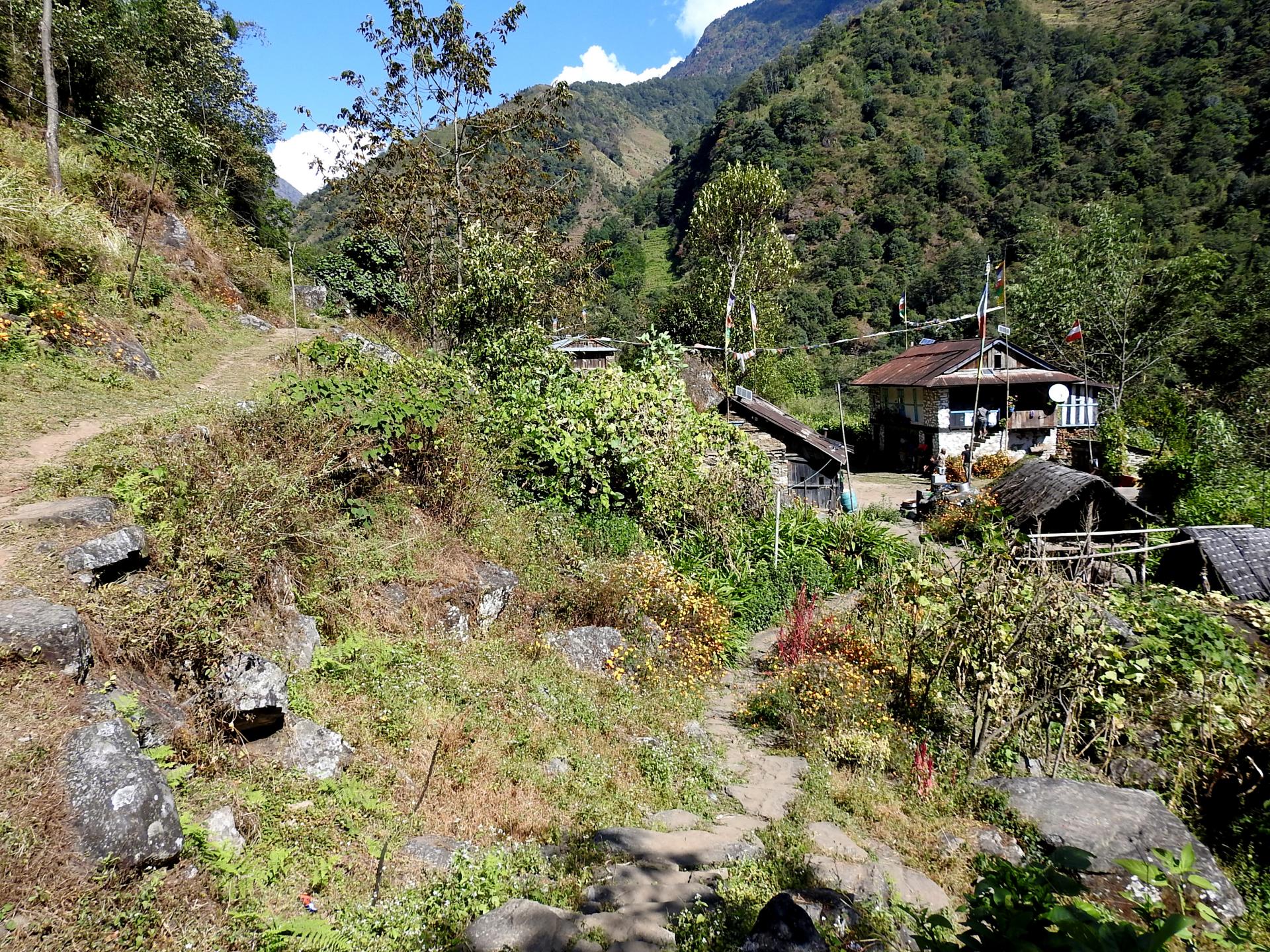 Mais revenons à l'itinéraire... Le sentier continue de louvoyer à flanc de coteau en forêt bien évidemment colonisée par les pieds d'alaï ci. On franchit une falaise verticale sur un sentier aménagé avant de passer à proximité d'une passerelle métallique (15mn, 1610m). On poursuit tout droit en RD de la Tamur khola pour une petite grimpette en escaliers qui permet de rejoindre une nouvelle passerelle métallique sur la Thakpa khola (5mn, 1660m). Sur l'autre rive, au niveau de la fourche de sentiers qui suit, on continue sur la D sur un chemin en montée qui s'en va évoluer à hauteur de la Tamur khola. On entre dans le pays bouddhiste et l'on commence à croiser davantage de murs de manis sur lesquels les codes hindouistes ont disparu (rubans rouges, clochettes, etc.). Les darchoks colorés apparaissent sur les toits des maisons. On dépasse la ferme de Sangduwa (40mn, 1745m) qui annonce, au bout du chemin herbeux, le village de Gowatar (15mn, 1820m, lodges).