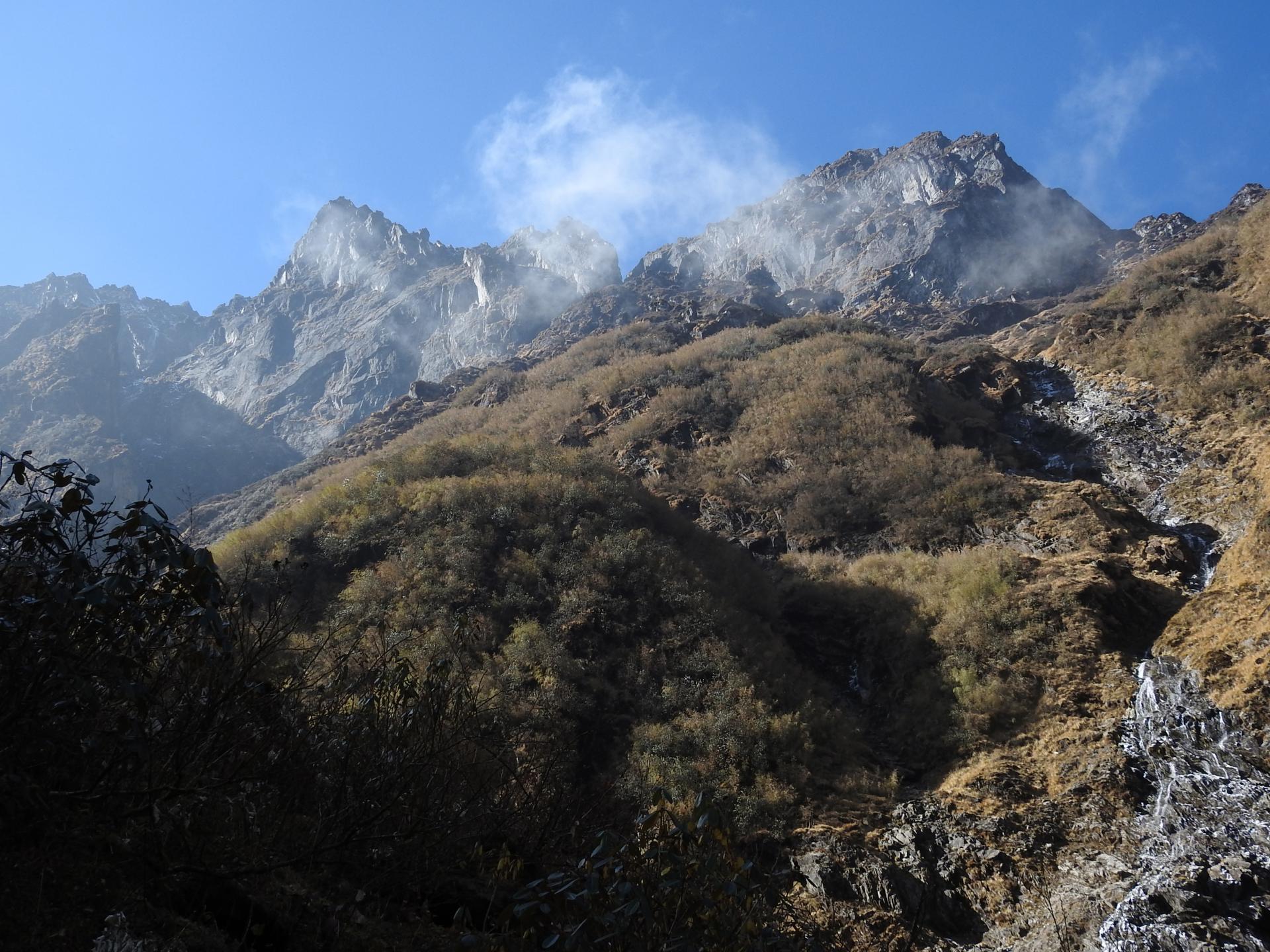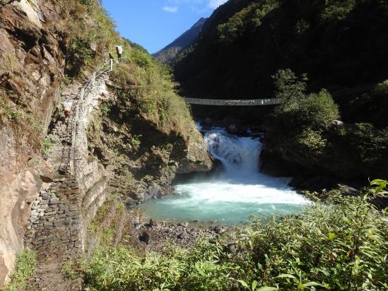 Diaporama On descend la vallée de la Dhungge khola en RD. On traverse un peu plus bas une grande kharka (15mn, 3505m, camp possible, eau) puis on s'engage au milieu des buissons de rhododendrons. Au cours de ce périple on se rapproche deux fois du lit de la rivière. Puis, on pénètre dans la forêt de bambous où l'on traverse successivement deux cascades (40mn, 3300m). Un peu plus loin, on descend en zigzags serrés bien marqués au cœur de la bambouseraie pour finir par une dégringolade sur un escalier bien pentu à flanc de falaise proéminente.