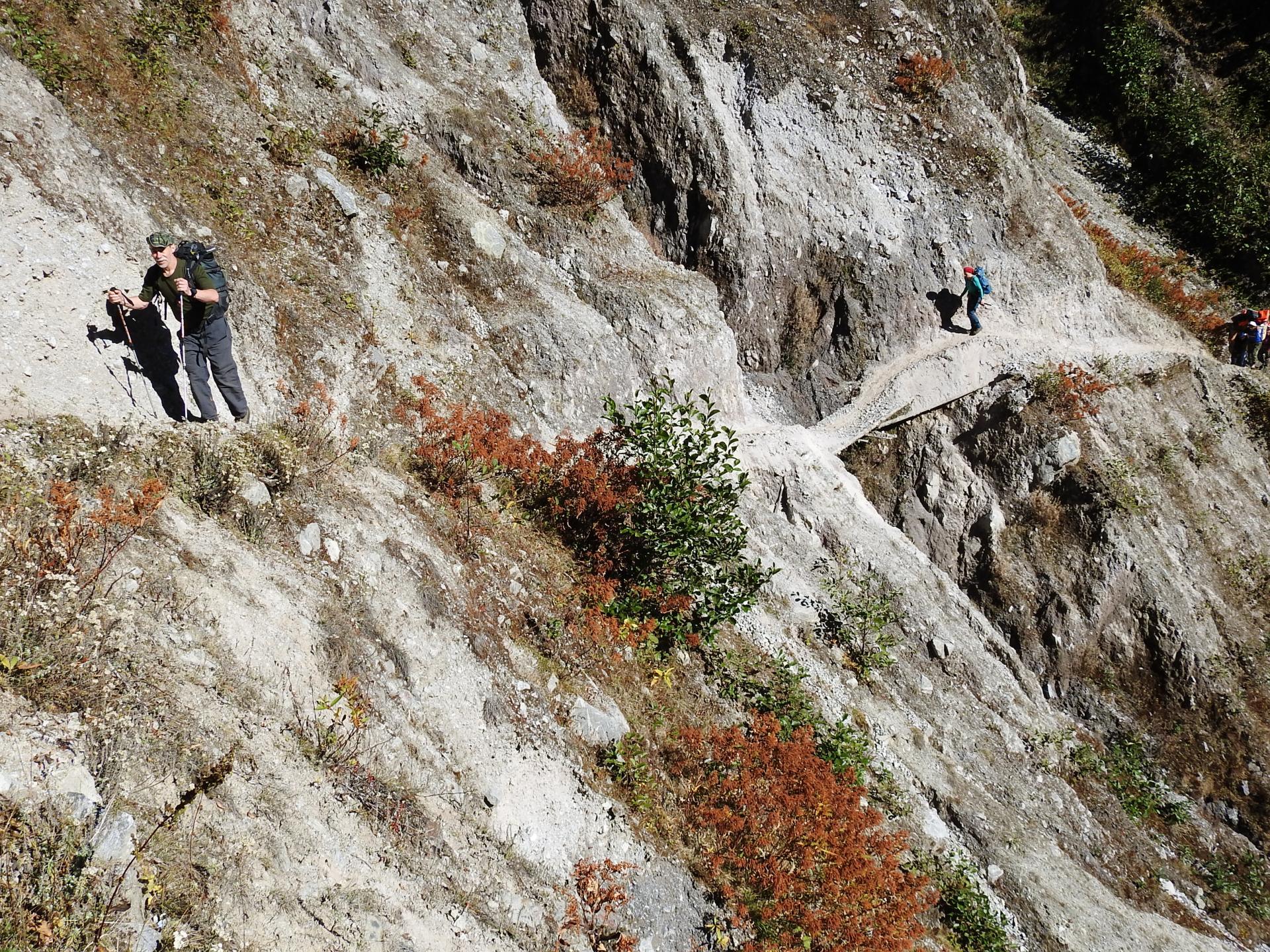 Diaporama On sort du village par le S en s'élevant un peu au-dessus de la rivière pour de suite commencer une descente en RD sur le même type de chemin caillouteux que celui qui nous a conduits à Thudam la veille. On évolue dans de belles portions de forêt primaire au milieu desquelles on doit traverser deux couloirs d'éboulis bien creusés et pentus de taille gigantesque. On rejoint une kharka (45mn, 3300m) et, au-delà, on s'engage à découvert sur un sentier-balcon très étroit en pente descendante qui se termine à la base d'un troisième couloir d'éboulis, lui aussi, très creusé (15mn, 3225m). Après l'avoir franchi, retour en forêt un peu moins débroussaillée jusqu'à la cote 3080 où on laisse la rivière après qu'elle nous ait offert un dernier spectacle avec une cascade bouillonnante. On monte dans le coteau à main D en zigzags très serrés pour atteindre un belvédère (40mn, 3180m, chautara). 10m plus haut, au croisement de chemins, on suit les indications de la pancarte qui invitent à partir sur la G pour rejoindre en descente maîtrisée le fond d'un thalweg (5mn, 3155m). On traverse le torrent pour s'engager en face sur le sentier-balcon étroit à flanc de coteau qui débute par une marche étale. Soyez prévenants ! Il n'est pas rare d'y croiser (avec difficulté vue l'étroitesse du chemin...) un yack solitaire et, plus dérangeant, vindicatif. Passée cette épreuve, on remonte en zigzags à flanc de falaise pour franchir un rognon rocheux (20mn, 3230m, grotte). C'est à partir d'ici que commence la partie la plus spectaculaire (ou pour certains "abominable") de l'itinéraire audacieux proposé par les locaux (et qui n'est bien évidemment pas celui tracé sur les cartes népalaises quelles qu'elles soient) : l'étroit chemin est construit à flanc de falaise en encorbellement bien au-dessus de la rivière. Et il n'y a pas qu'un seul passage osé : on peut en compter une bonne dizaine si ce n'est une quinzaine... Encore plus audacieux que les sentiers de l'Île de la Réunion dont la construction est pourtant une référence ! Cette première partie se termine par une montée en lacets dans une maigre forêt de rhododendrons afin de contourner une combe et déboucher sur le fil d'une arête (55mn, 3385m, lungtas).