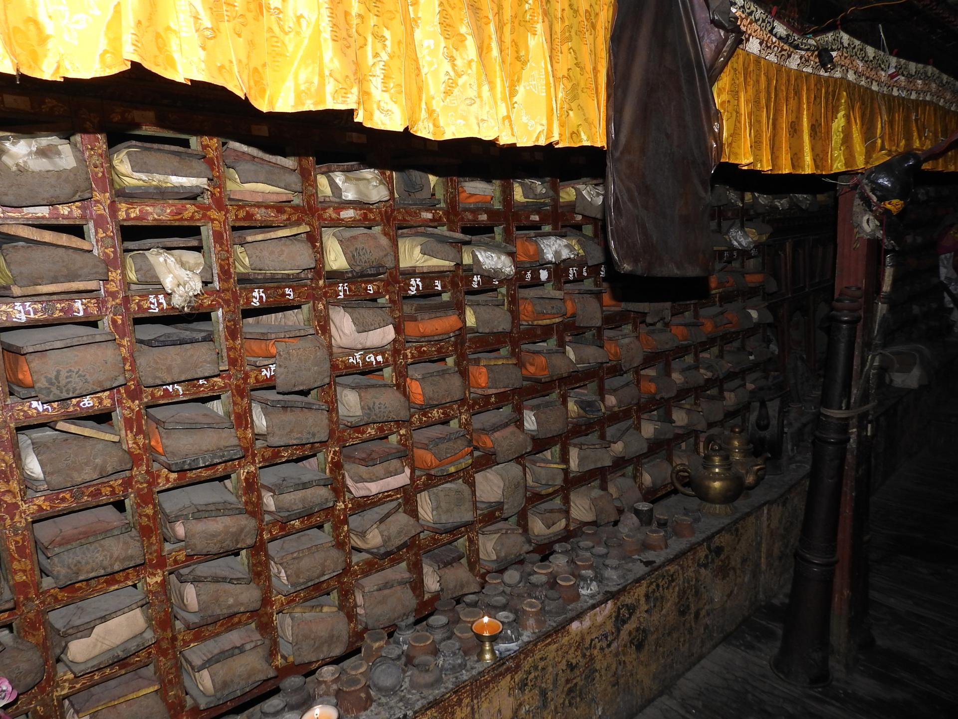 Il ne reste plus qu'à monter en biais en direction de la lèvre de la moraine pour atteindre la première maison d'Olangchun Gola, le lodge White Yak (40mn, 3190m, bhatti, boutiques pour ravitaillement et possibilité de compléter son trousseau de textile avant d'aller franchir le col...). Diaporama En direction du N, le village entièrement construit en bois s'étale sur 400m avec le vieux gonpa Diki Chöling perché dans le coteau (visite indispensable car la salle de prières est en tout point admirable). Noter qu'à chaque automne s'y déroule sur 3 jours un festival bouddhiste équivalent à celui de Tiji à Lo Manthang ; essayer de faire coïncider les dates du trek avec cet évènement (en 2017, ça débutait le 15 novembre). Nuit sous tente ou en lodge.