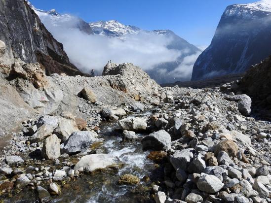 Au printemps 2017, la moraine frontale d'un lac glaciaire situé au-dessus des alpages de Langmale a explosé après que des séracs soient tombés d'un des glaciers du Chamlang himal. Un flot de boue a déferlé dans la vallée de la Barun nadi, raclant tout sur son passage jusqu'à la kharka de Yangri où quelques maisons de bois ont été emportées. On n'a pas eu à déplorer de mort d'homme mais des centaines de yacks ont été emportés par les flots. Le paysage que l'on va découvrir dans la deuxième partie de la journée pourra s'apparenter à celui d'un lendemain d'attaque nucléaire... Cette vallée autrefois verdoyante comme en attestent les cartes topographiques, n'est aujourd'hui qu'un immense champ de cailloux et de banquettes de sable. Et, bien évidemment, les sentiers qui existaient de part et d'autre de la Barun nadi ont été impactés, recomposant par là-même les itinéraires d'accès à cette vallée. Ceci dit, côté infrastructures, les népalais ont très vite réagi et ont reconstruit très rapidement les bâtiments détruits pour proposer le plus rapidement possible les services qu'attendent les trekkers sur cet itinéraire assez fréquenté (ravitaillement et couchage en chambre, froide...). Commerce, commerce !