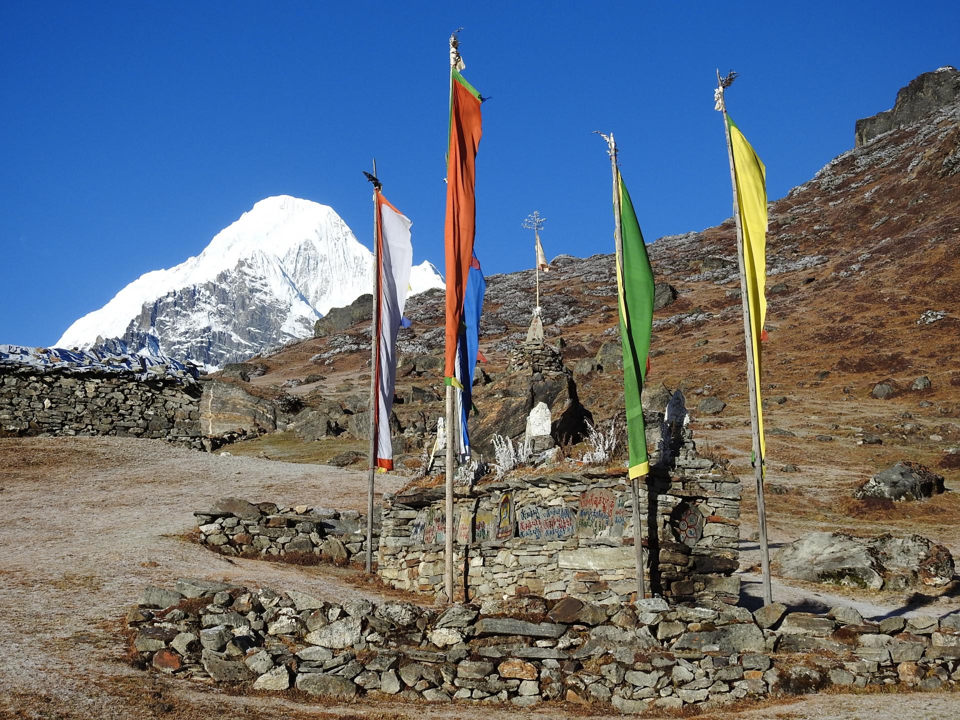 On descend pleine pente toujours vers le NW avec le Makalu en ligne de mire. On retrouve au milieu d'une haie de buissons de rhododendrons un large chemin bien marqué et cairné. On passe sous un drapeau bouddhiste (25mn, 3630m) et on incline un peu à D. On perd définitivement le balisage de cairns mais la trace toujours bien marquée est facile à suivre. On descend doucement jusqu'à traverser une portion plane à découvert (45mn, 3290m) pour suivre la crête. On atteint une petite prairie en belvédère (25mn, 3155m) avant de poursuivre tout droit pour remonter sur une petite butte et atteindre un deuxième belvédère (10mn, 3095m, drapeaux bouddhistes et mini temple hindouiste).