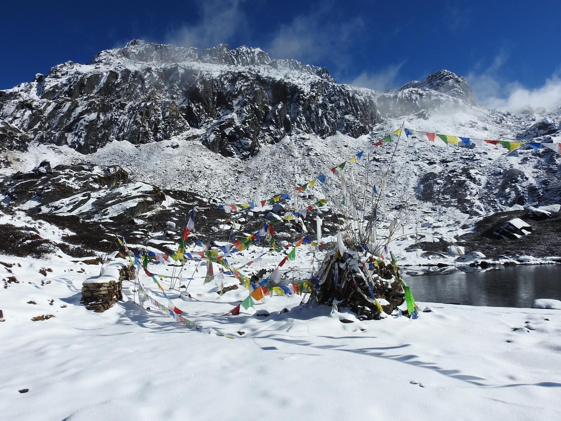 Après avoir déposé une guirlande de lungtas et invoqué les dieux pour qu'ils intercèdent dans la démarche d'un "Tibet libre", on descend par le même chemin pour se retrouver au dernier lac auprès duquel on était passé (20mn, 4090m). Mais, au lieu de descendre au S, on part à niveau légèrement sur la D pour fouler un deuxième plateau lacustre après avoir effacé un collet où il y a une bergerie ruinée (5mn, 4090m). On traverse le plateau vers le SW pour monter en biais à flanc de coteau herbeux : on domine le plateau lacustre et, alors que l'on va franchir une épaule rocheuse (20mn, 4185m), voici qu'apparaissent tout à l'E le Kangchenjunga, le Jannu et la chaîne des Kabru. Quelle belle surprise ! On incline la marche à D pour rejoindre le fil d'une crête herbeuse (5mn, 4230m), crête que l'on va suivre pendant 400m vers le N. En bas à gauche, on découvre la combe dans laquelle sont essaimés les Panch pokhari. Vers 4240m, on bascule sur la G en descente modérée pour contourner la combe par sa droite afin de rejoindre la vallée de la Dhungge khola que l'on distingue tout en bas. On dépasse une bergerie ruinée perchée sur un mamelon (25mn, 4190m) pour trouver juste derrière le départ d'un beau sentier qui évolue en RD de la vallée à hauteur des lacs.