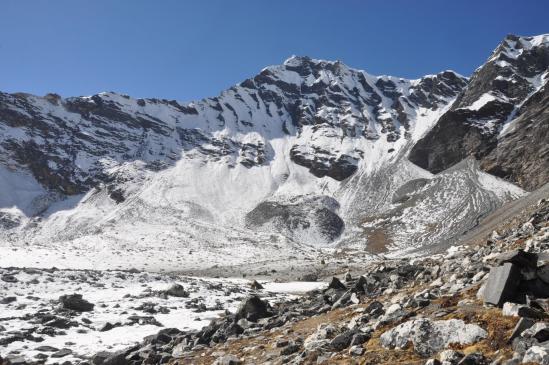 On traverse une rangée de blocs pour rejoindre la RG. Quand le lac est à moitié vide, comme c'est le cas en automne, on marche sur le sable fin (ce doit être un peu plus problématique si l'on doit évoluer sur les blocs morainiques...). Et, par une dernière remontée, on atteint la kharka qui se trouve juste au N du lac (20mn, 5025m, bhatti avec couchages). Ici, le vallon est large et la face N du Chamlang aux ice-flutes bien dessinées domine. A l'E, seule la partie sommitale du Hunku himal émerge des moraines alors qu'au N, Nuptse, Sagarmatha et Lhotse occupent toujours l'horizon. On distingue la crête au milieu de laquelle s'inscrit le col de l'Amphu Lapsa. Celle-ci se confond avec l'un des glaciers suspendus du Nuptse. Juste en-dessous ce ne sont que des champs de moraines au milieu desquelles on devine que dans les creux doivent bien se trouver quelques uns des lacs des Panch pokhari. Mais la découverte est pour demain... Nuit sous tente.