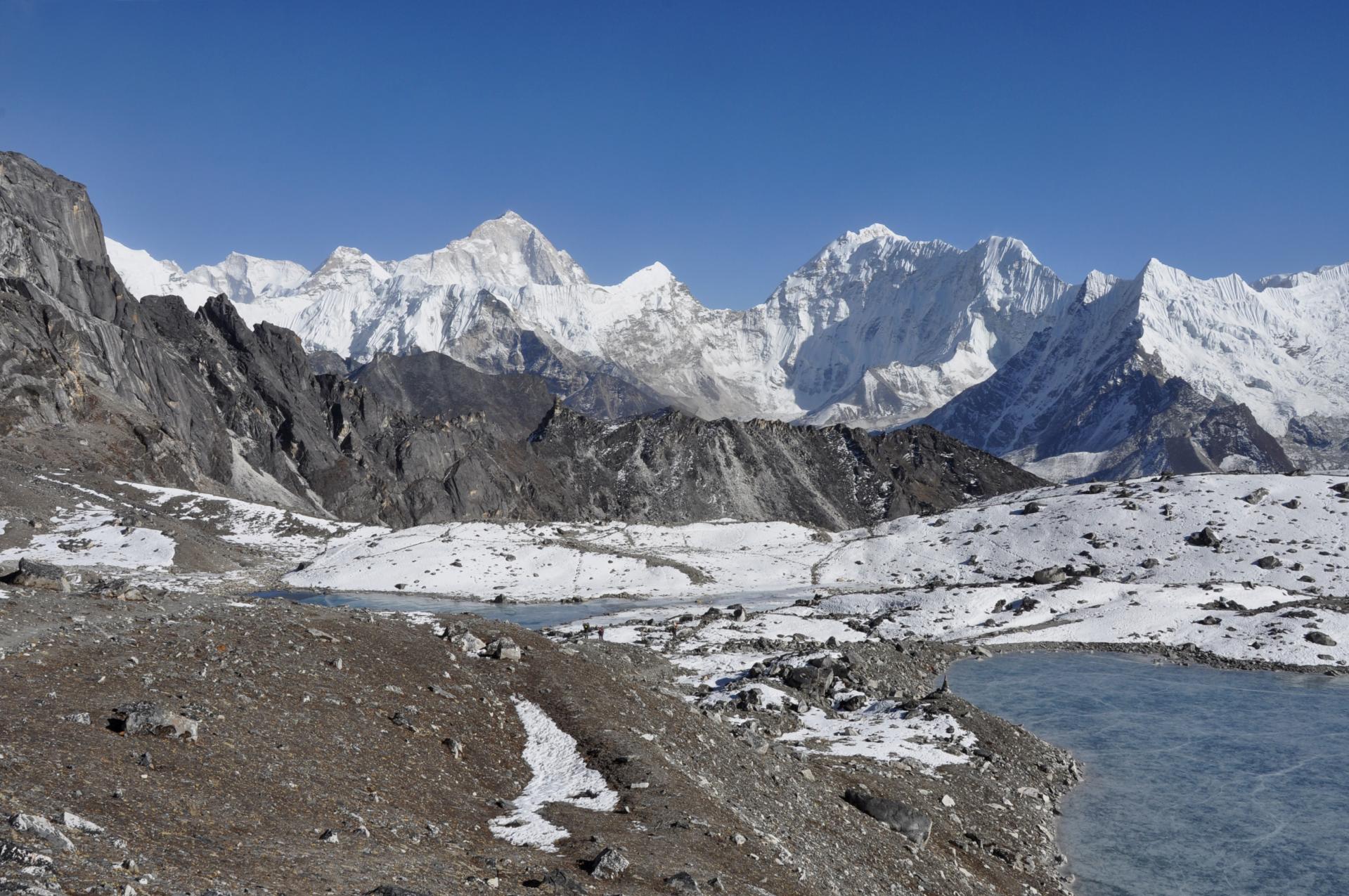 En prenant de la hauteur, le sommet glaciaire qui se situe à la gauche du Chamlang émerge de derrière ses imposantes moraines. Un peu plus loin (35mn, 5160m), on atteint un belvédère à la jonction de deux vallons : à gauche, c'est le sommet de l'Ombigaichan qui se présente au pied duquel se situe le « terrible » Mingbo La qui donne accès au bassin S de l'Ama Dablam, à droite, c'est une enfilade de lacs morainiques qui se termine au pied du Kali himal et du Baruntse. On poursuit tout droit en RD de la vallée en contournant les lacs par la G en se dirigeant vers la base d'une moraine qui descend du Kali himal.