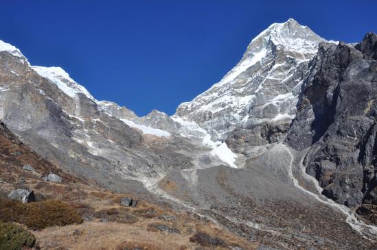 Diaporama On quitte le village en traversant la moraine caillouteuse en direction du NE pour trouver le départ du sentier du Mera La que l'on trouve au pied d'une moraine herbeuse. On atteint un collet sur la moraine (40mn, 4420m) duquel on peut apprécier la chute vertigineuse du Sabai glacier mais pas le lac...! Le sommet du Kyashar présente une face rocheuse verticale qui se termine en pointe acérée tandis qu'à l'arrière on peut contempler l'enfilade de la crête glaciaire du Charpote himal du Kusum Kanguru à droite jusqu'au Gonghla à gauche et même au-delà jusqu'au col du Zatr Teng.