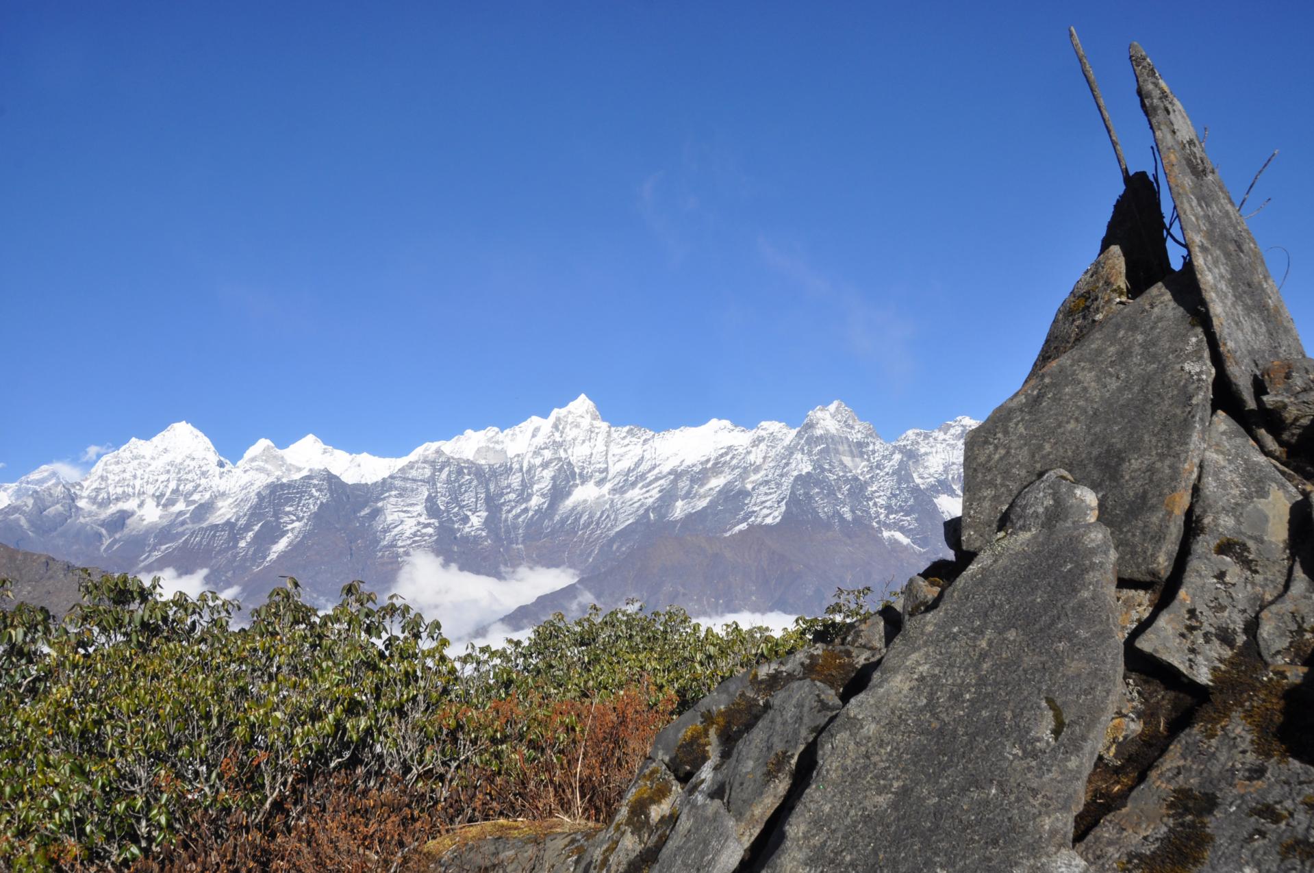 Diaporama On poursuit sur la Goyang danda en forêt au-dessus de la kharka jusqu'à traverser une clairière (20mn, 3055m). Derrière, c'est une rude montée entre les rhododendrons dans un coteau bien redressé sur une sente qui a tendance à rétrécir... La pente s'affaiblit à l'entrée d'une large clairière malheureusement colonisée par les buissons d'épineux. Juste au-dessus, un petit « coup de rein » offre un panorama exceptionnel sur les montagnes du Rolwaling depuis une kharka (45mn, 3225m, eau en contrebas vers le S, campement possible). Pour info, c'est ici que le sentier qui monte d'Hulakgaon rejoint la crête. On sort de la forêt pour contourner à flanc côté S une épaule rocheuse et, après être passé dans un collet puis avoir effacé une petite grimpette, le sentier redevient étale pour atteindre une nouvelle kharka (45mn, 3375m, eau 200m sous les arbres au NW, campement possible). A présent, on s'élève par à-coups : une grimpette, un plat, une grimpette, un plat... Un mur de manis (20mn, 3425m) annonce une nouvelle kharka avec pour la première fois un habitat en pierre. C'est tout en haut que se situe le lhato entouré de darchoks sensé protéger le système d'eau de la vallée (10mn, 3475m). Il s'ensuit une bien belle côte dans les buissons de rhododendrons jusqu'à atteindre une chauttara (30mn, 3635m). Au-delà, la pente reste relevée jusqu'à une kharka (20mn, 3715m, chauttara). On poursuit pleine pente pour s'en aller franchir une épaule (15mn, 3805m) de laquelle apparaît le Baramji dont le sommet croule sous les lungtas. On se dirige vers sa base où l'on trouve un emplacement plat pour établir le camp (10mn, 3850m). Nuit sous tente. Normalement l'eau coule dans le petit thalweg qui descend du Baramji sur la droite mais s'il fait trop froid, il n'y aura pas d'eau. Reste à faire fondre la neige...
