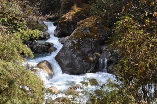 Diaporama Du vaste espace de prairies, le sentier remonte vers l'E. Après 300m, on laisse le sentier principal descendre vers Shivalaya et on monte sur la G dans les rhododendrons rejoindre une petite crête. En haut, le chemin se poursuit sur la G en quasi courbe de niveau vers l'E. Le sentier mi-chèvre mi-homme est tracé à flanc d'un coteau bien pentu. Une dernière épaule contournée et on se met à descendre vers le fond du vallon avec la volonté affichée d'aller traverser la rivière bien au-dessus de la cascade. En chemin, on croisera une bergerie sous roche, on traversera deux torrents et on dépassera un darchok (1h, 3855m).