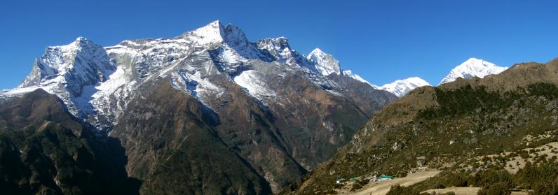 Journée d’acclimatation à l’altitude avec comme étape à la mi-journée un magnifique village sherpa pour lequel la fondation Hillary a beaucoup investi, Khumjung, si bien que plus propre et mieux rangé que ça, tu ne trouves pas au Népal, ça a tout l’air d’un village de montagne en Suisse… Dans Namche à 3440m, monter par la ruelle en escalier jusqu’au col dans lequel s’inscrit le Thamserku. Prendre un petit sentier sur la G qui démarre par trois ou quatre marches scellées dans un muret avant d’escalader le coteau en lacets serrés jusqu’à rejoindre l’extrémité de la piste de l’altiport de Syangboche. Poursuivre vers le haut jusqu’au lodge pour une vue admirable sur les 6856m de l’Ama Dablam qui se dresse fièrement en regard de ses prestigieux voisins que sont les Lhotse et l’Everest ; on ne dirait pas, mais si fière soit-elle, les chiffres parlent d’eux-mêmes, elle leur rend respectivement 1600 et 2000m sous la toise ! La vallée qui s’étale devant nous permet de deviner le parcours qui sera le nôtre dans les prochains jours au retour de notre périple aux lacs Gokyo : arrivant de la vallée de gauche fermée par le Kyajo Ri, nous passerons tout en haut par le village de Phortse qui se chauffe lascivement aux rayons du soleil, étalé sur l’épaule S du Taweche, puis nous emprunterons le sentier qui court à flanc de falaise (il est beaucoup moins vertigineux qu’il ne le paraît) et remonterons la large vallée de l’Imja khola jusqu’à Dingboche que l’on devine dans la plaine tout au fond. Mais revenons au présent : le paysage est grandiose et présente à nos pieds, sur la colline boisée, le monastère de Tengboche. Sur sa droite, deux montagnes dominent, le Thamserku occulté en partie par le Kangtega serti d’impressionnants séracs sommitaux. Ces deux-là vont nous accompagner pour le reste de la journée… Poursuite en sentier-balcon jusqu’à un nouveau Everest View Lodge (celui-là est un hôtel de grande classe construit par les japonais, à rapprocher de la présence d’un altiport en pleine cambrousse…). Le contourner par la G puis, après un petit parcours en forêt, descendre à G sur le village de Khumjung (2h30, 3790m, lodges) qui s'étale sur un large plateau.