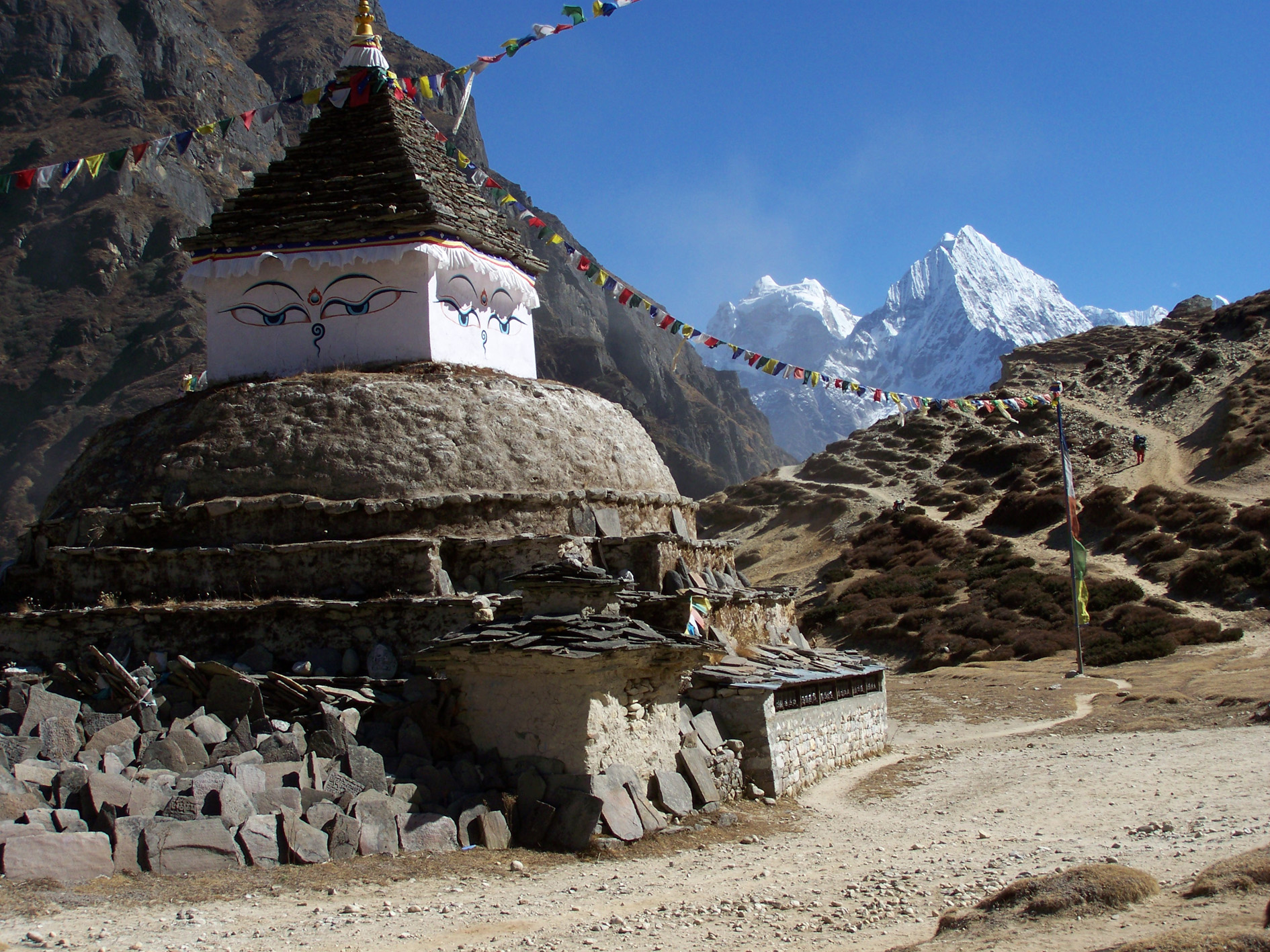 Flash-back en 1953 : le royaume du Népal vient de s’ouvrir aux étrangers. Les anglais se proposent de monter une expédition ayant pour but l’ascension de la plus haute montagne de la Terre : l’Everest. Imaginez une caravane qui s’étire depuis Kathmandu jusqu’au camp de base ! D’abord se déplacer vers l’est de près de 150km de la vallée de Kathmandu à Jiri, un petit village du Solukhumbu, région du piémont himalayen. De vallée en vallée, la caravane est confrontée à d’incessantes traversées de rivières qui descendent toutes vers le sud rejoindre le Gange au-delà des frontières du royaume, en Inde. L’itinéraire n’est pas viabilisé et l’équipée doit se frayer un passage dans la jungle avec, au printemps, les sangsues qui tombent des arbres s’accrochant au moindre bout de peau laissé à l’air (eh oui, il n’y avait pas la route à l’époque, ce n’est que bien après que les suisses ont créé la route tortueuse que vous emprunterez pour vous rendre à Jiri). Mais à Jiri, on est encore loin du but : notre caravane s’engage sur un nouveau sentier toujours en direction de l’est. Enfin, au bout d’une bonne semaine, on rejoint la vallée de la Dudh kosi. Tout ce beau monde va remonter jusqu’au hameau de Namche bazar. Au-delà, on continue le long de l’Imja khola, laissant la Dudh kosi s’en aller vers les lacs Gokyo et le Cho Oyu, puis s’engage dans la vallée morainique que le Khumbu glacier a creusée. L’épopée d’une quarantaine de jours se termine au milieu d'un splendide cirque de montagnes glacées au pied du Peak XV, Sagarmatha pour les népalais, Chomolungma pour les tibétains, Everest pour nous autres, du nom du géographe anglais qui avait conduit une expédition de relevés topographiques au XIXème siècle. John Hunt, chef de l’expédition, Edmund Hillary et Tensing Sherpa sont, entre autres, de la partie. Il ne reste plus qu’à partir à la conquête du sommet, là-haut, juste derrière la terrible ice-fall. La route de l’Everest est née. Longtemps après, cette route fascine toujours par le caractère historique qui colle à chaque mur de manis que l’on longe ou stupâ que l’on contourne. Ils sont passés par là…