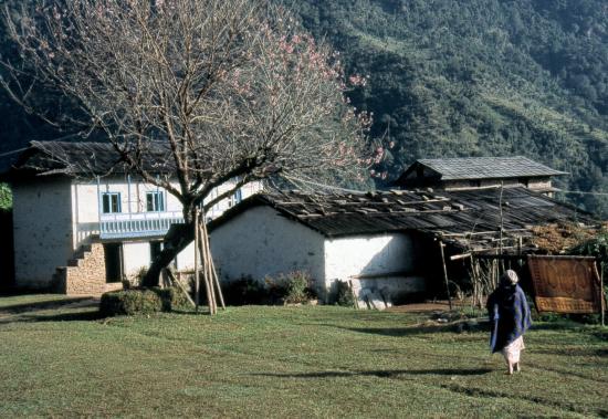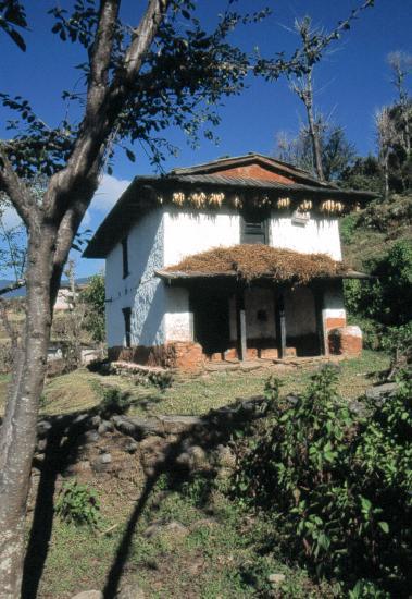 On quitte la rive de la Khimti khola pour s’élever au milieu des champs en terrasse. Nous passons à Ghatkhola puis dans deux autres hameaux avant d’arriver au village de Deurali (3h, 2705m, lodges), ses murs de manis, ou mendans, et son chörten marquant le passage du col. Si la brume de chaleur n’est pas trop envahissante, peut-être commencerez-vous à discerner le faîte de quelques montagnes du Khumbu ? En tout cas, on peut en profiter pour s’arrêter casser la croûte dans une bhatti au bord du chemin, un bon dal bhat et ça repart ! Descente en 1h sur Bhandar (ou Changma, 2194m, lodges, transports) par un sentier pavé de larges dalles.