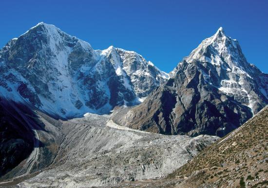 Au-delà du chörten, le sentier parcourt en courbe de niveau (ou presque…) une moraine herbeuse qui constitue un superbe belvédère sur les Taweche et Cholatse, impressionnants de verticalité (on comprend la raison pour laquelle ils sont assez peu parcourus). Au fond, le Lobuche peak ferme l’horizon. La montée est progressive jusqu’à Dughla (2h, 4620m, lodges). On enfile une boisson chaude avant d’aborder le gros morceau de la journée, à savoir la grimpette sur le faîte de la moraine frontale derrière laquelle se cache encore le glacier du Khumbu. Un col marqué par la présence d’une multitude de cairns permet de se poser un moment (1h, 4870m). Erigés en mémoire des alpinistes japonais morts dans une avalanche survenue il y a quelques dizaines d'années et qui a balayé le camp II, c'est devenu aujourd'hui le "fourre-tout" de tous ceux qui sont décédés en montagne et pas forcément dur les pentes de l'Everest... Le Khumbu s’étale à nos pieds avec sa ribambelle de sommets glacés ; on peut apprécier le chemin déjà parcouru. Plus avant, le Pumori et le Lingtren se sont rapprochés et attendent notre visite. On traverse une grande étendue morainique plane dominée par le Nuptse. Bientôt, le hameau de Lobuche se dévoile au détour d’un repli du terrain. On y trouve une grosse dizaine de lodges pour y passer la nuit, froide assurément (1h, 4930m).