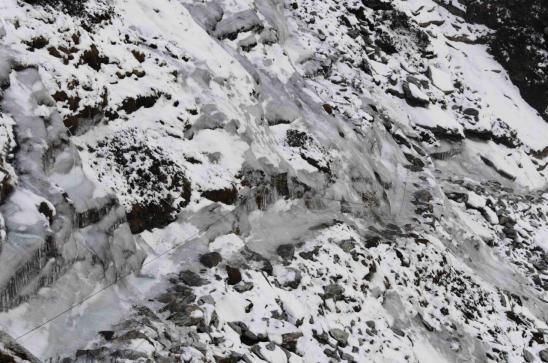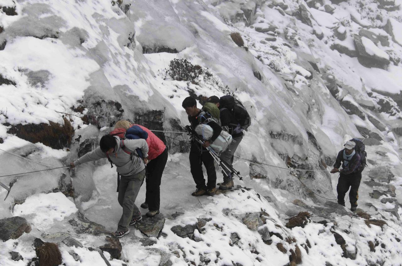 Attention ! Cette étape utilise un sentier escarpé muni d'une main courante pour aider à la traversée d'un couloir rocheux pentu souvent à l'ombre. En saison de trek (printemps et début d'automne) il ne pose habituellement aucun problème pour son franchissement mis à part qu'il y a un peu de "gaz"... Mais lorsque les conditions météorologiques du printemps ou de la fin de l'été n'ont pas été au mieux, c'est-à-dire que la pluie est tombée, qu'il a gelé au sol et que cette glace ne pourra plus fondre avant la saison suivante du fait que le passage est orienté au nord, difficile de le franchir sereinement et en toute sécurité (comme l'attestent les photos prises en novembre 2013 par un de mes amis @Marc_Lesquir). Il y a réellement danger de mort ! Un conseil ? Rebroussez chemin et passez par l'itinéraire conventionnel qui depuis Thame remonte sur Namche Bazar.