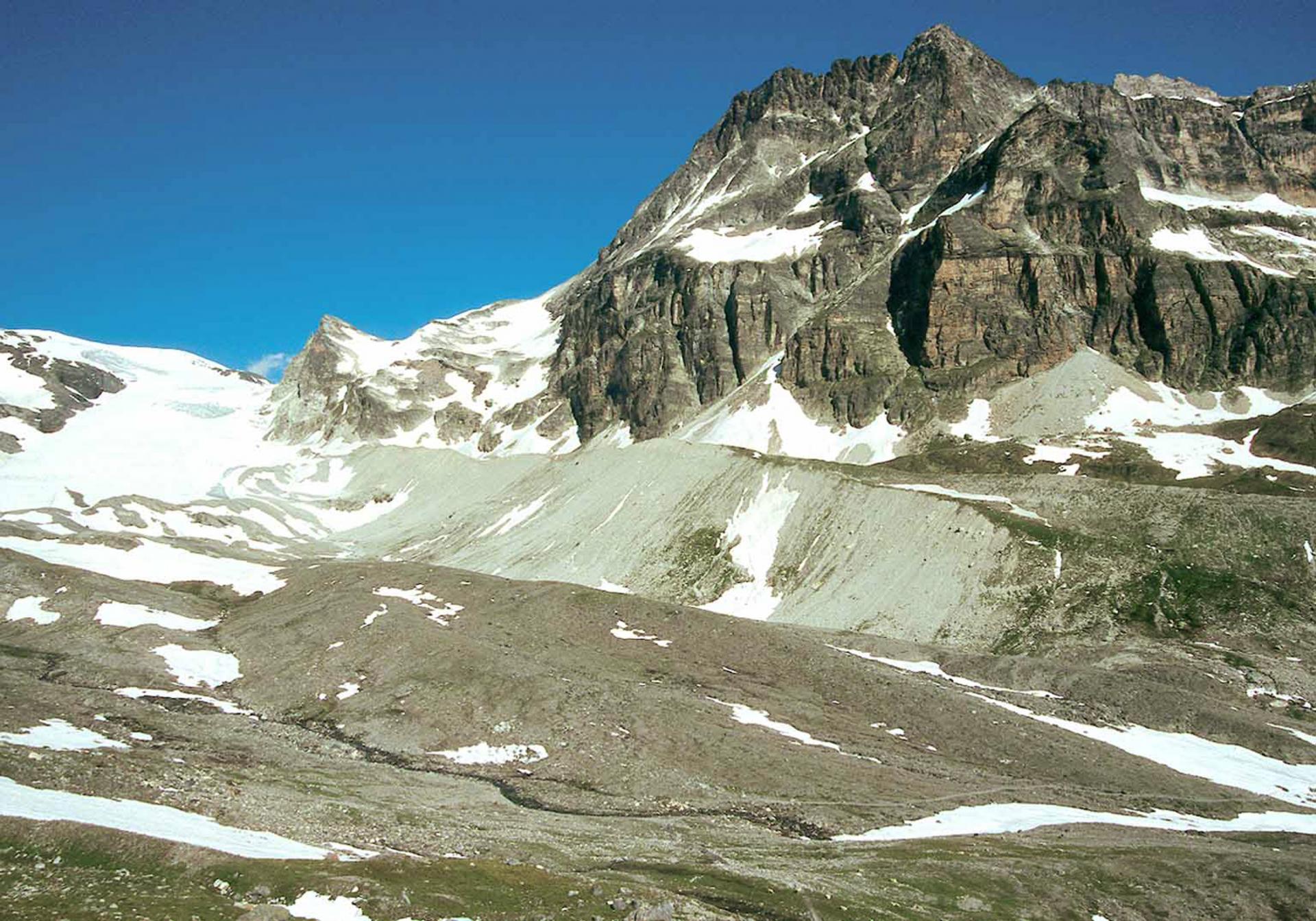 - vous montez dans le vallon, et à proximité du petit lac vers 3000m, vous bifurquez sur la G, au pied du névé terminal, en direction du Roc Noir pour passer au col du Grand Vallon à 3124m. L’itinéraire de descente converge avec le précédent au niveau du Plan des Arioux.