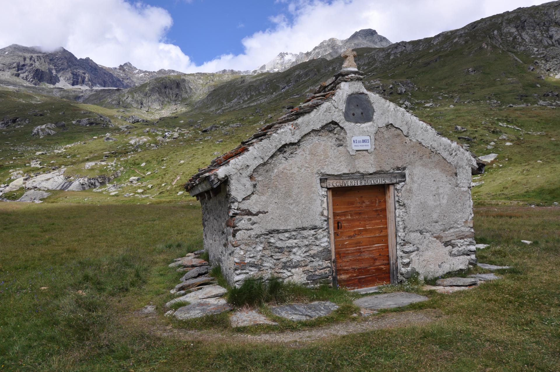 Reprendre le sentier par lequel nous sommes arrivés hier mais continuer tout droit pleine pente au croisement. On s’élève ainsi dans la forêt jusqu’aux bergeries de la Loza à 2350m (3h depuis notre départ). Le lieu prédispose au pique-nique face aux montagnes qui bordent au sud le Val d’Ambin. Il s’ensuit un parcours qui reste plus ou moins de niveau, passe dans une combe rocailleuse et austère sous la face S de la Dent Parrachée (bouquetins et marmottes), traverse plusieurs hameaux d’altitude abandonnés (la Ferrière, Montafia, la Juliette) avant d’atteindre le Mont. Il ne reste plus qu’une petite demi-heure pour atteindre le refuge de l’Arpont (PNV réservation au +33 479205151) perché sur son petit tertre au bord du chemin à 2309m.