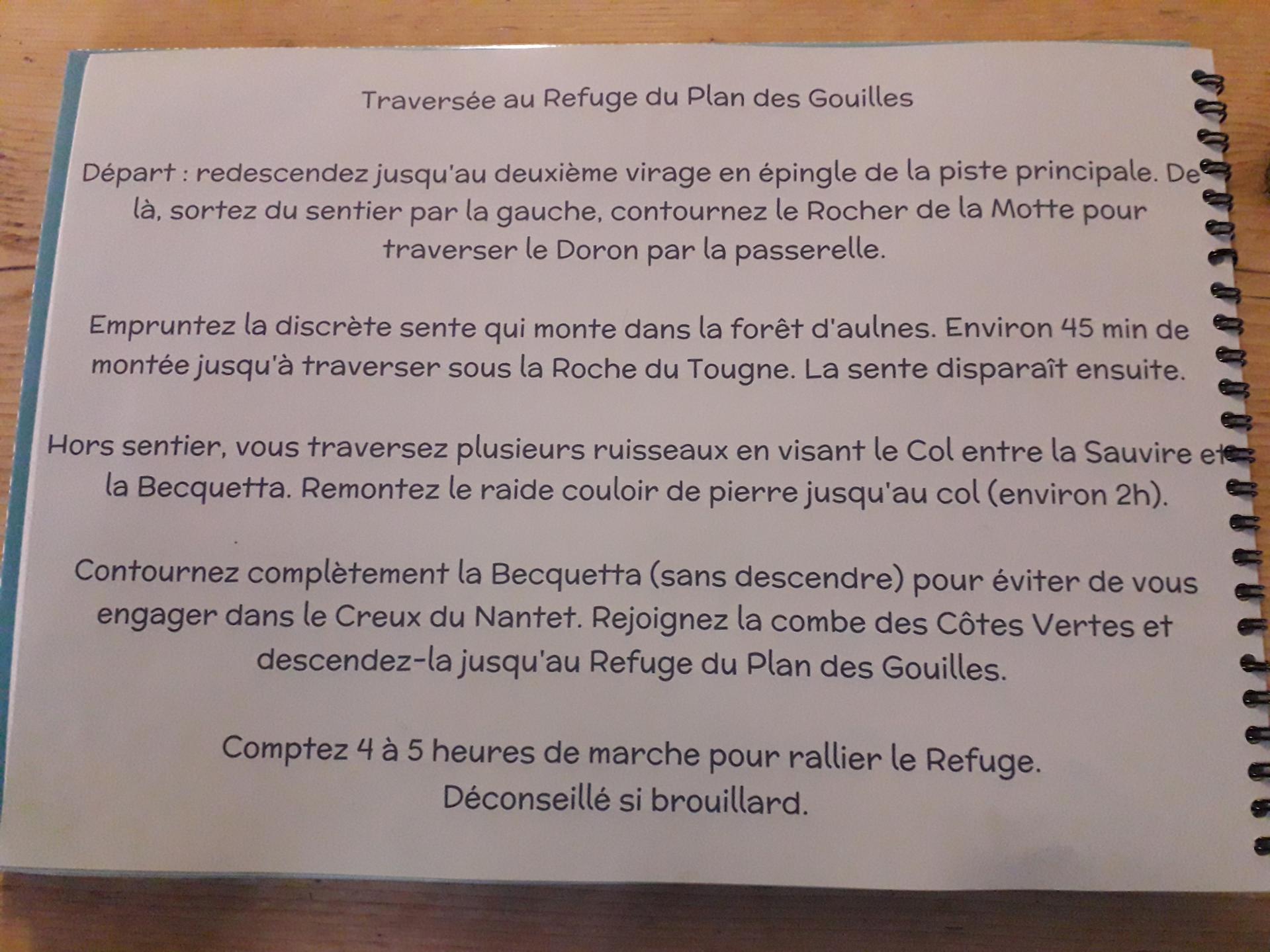 Itinéraire alternatif : proposition d'Isabelle (juillet 2019) "pour éviter la piste et la route, j'ai suivi un itinéraire hors sentier trouvé au refuge de la Glière. Je vous le mets en pièce jointe. On arrive au refuge du Plan des Gouilles et puis j'ai continué jusqu'au refuge du Grand Bec"