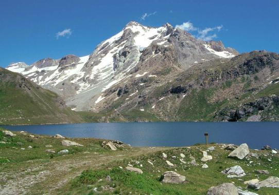 Départ de notre randonnée itinérante au rond-point (rive N du lac). Nous sommes à 2000m et nous nous élevons sur un large chemin qui s’incurve vers la D et propose un itinéraire balcon sur la retenue de barrage du lac du Chevril. Le sentier suit la courbe de niveau, on passe au-dessus du village des Boisses et nous retrouvons sur la droite le chemin qui en arrive. En face de nous, l’imposant Dôme de la Sache (3604m) nous domine et présente ses glaciers suspendus. A présent, direction W puis SW en remontant tout d’abord le vallon de la Sache puis, après être passé à proximité de petits lacs, le vallon qui nous conduit jusqu’au col de la Sachette à 2713m (3h). L’ambiance est très minérale. L’itinéraire se poursuit maintenant vers le bas sur les nombreux névés qui encombrent le fond du vallon. Ceux-ci permettent d’atteindre plus rapidement le Plan de la Sache et par une dernière descente le Plan de la Plagne sur lequel sont construits quelques chalets. Nous traversons la rivière et remontons le sentier qui conduit au Refuge d’Entre-le-Lac, construit dans les bâtiments d’une ancienne bergerie (tel : +33 479042044). Il est posé à 2145m à quelques centaines de mètres en amont du lac de la Plagne et dispose d’une vue splendide sur les 3779m du Mont-Pourri.
