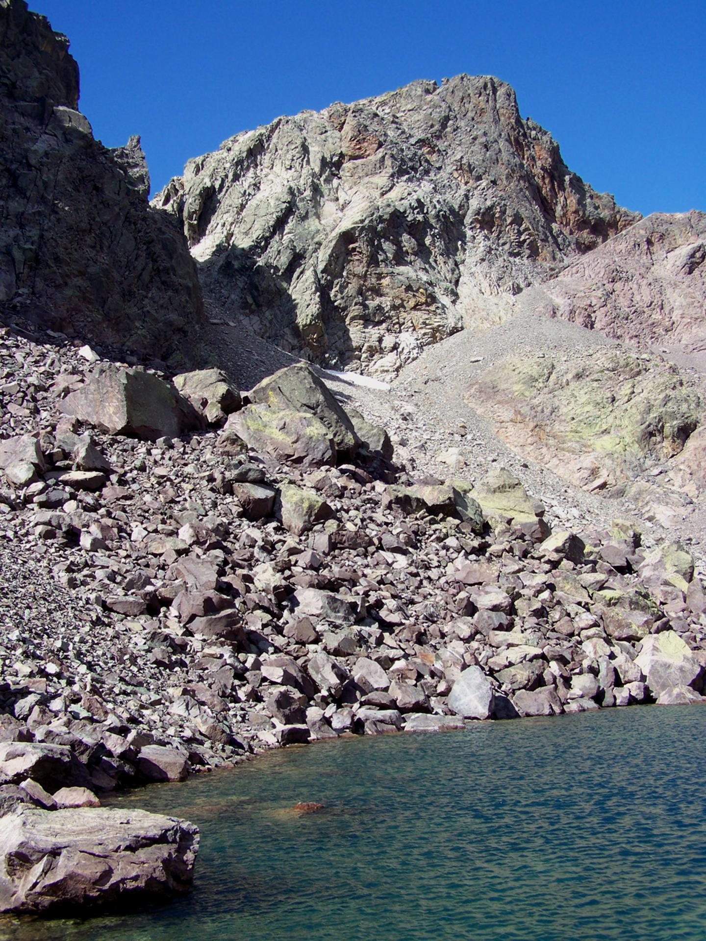 Du lac, remonter sur la D la trace cairnée qui aboutit rapidement à un replat, 100m au-dessus du lac. Laisser les cairns et prendre une direction N pour emprunter un cheminement plus aisé que la marche proposée dans les éboulis en s’aidant des banquettes rocheuses que l’on voit sur notre G. En 45mn, on arrive sur l’arête à mi-chemin de la Bocca Crucetta et de la Pointe des Eboulis. La partie W de la Grande Barrière se révèle à nous (Paglia Orba, Punta Minuta, Capu Larghia, etc.). A l’horizon, golfe de Porto à l’W, baie de Calvi au N, un véritable enchantement des yeux. Nous retrouvons le sentier cairné qui parcourt la crête et partons sur la D pour atteindre en 30mn la Pointe des Eboulis. De ce point, possibilité d’un A/R d’1h30 pour visiter le sommet du Monte Cinto, point culminant de l’île (non compté dans le cumul horaire de la journée). Descente scabreuse mais heureusement bien balisée qui n’offre pas un moment de répit pour le randonneur chargé... à l’exception de la halte bien reposante pour le pique-nique au minuscule lac d’Argentu posé sous l’austère face N du Cinto (1h). La suite, eh bien, ce sont les 2 heures d’horreur de traversée de pierriers en désescalade de rognons glaciaires qui rythment la descente vers le plateau de Stagnu au milieu duquel est située l’ex-station de ski de Haut-Ascu.