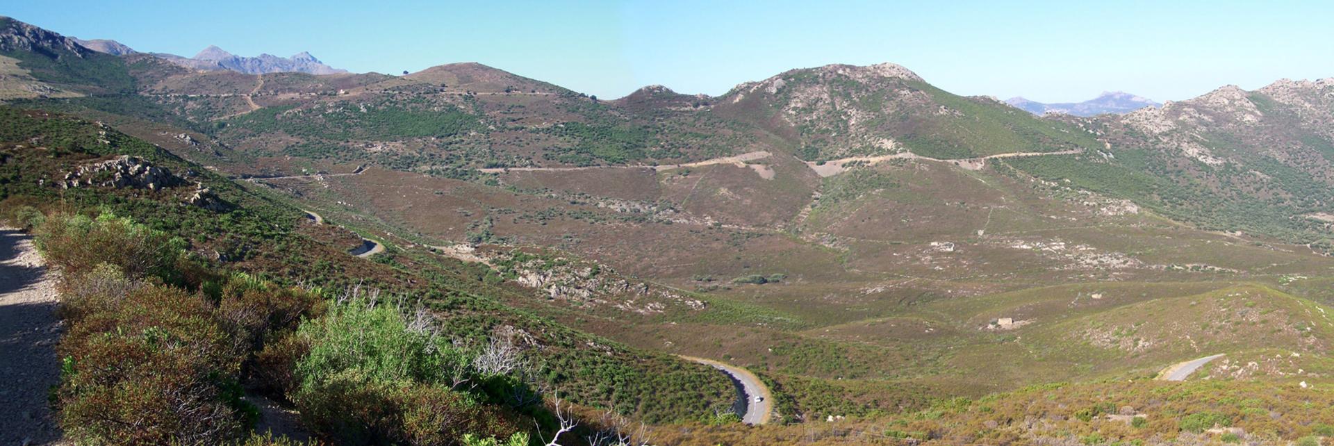 Emprunter la rue en pente jusqu’à la RD763. Toujours tout droit, on traverse ainsi le hameau d’Acquillacce (fontaine à gauche) puis en suivant les marques oranges du nouveau sentier C1, on traverse Altiani et on arrive sur le goudron au lavoir (dernier point d’eau avant le bivouac, 30mn). Nous dominons à présent la cuvette dans laquelle s’étalent tous les hameaux qui composent la commune d’Olmi e Cappella. Après la halte roborative, montée derrière le lavoir sur un chemin alternativement balisé en bleu et en orange qui nous conduit en 1h à la Bocca a a Lecca (1093m). La mer ! On prend la piste sur la D pour rejoindre tout d’abord le site de l’oratoire St Antoine puis la RD936 un peu en-dessous due la Bocca di u Prunu (1h).