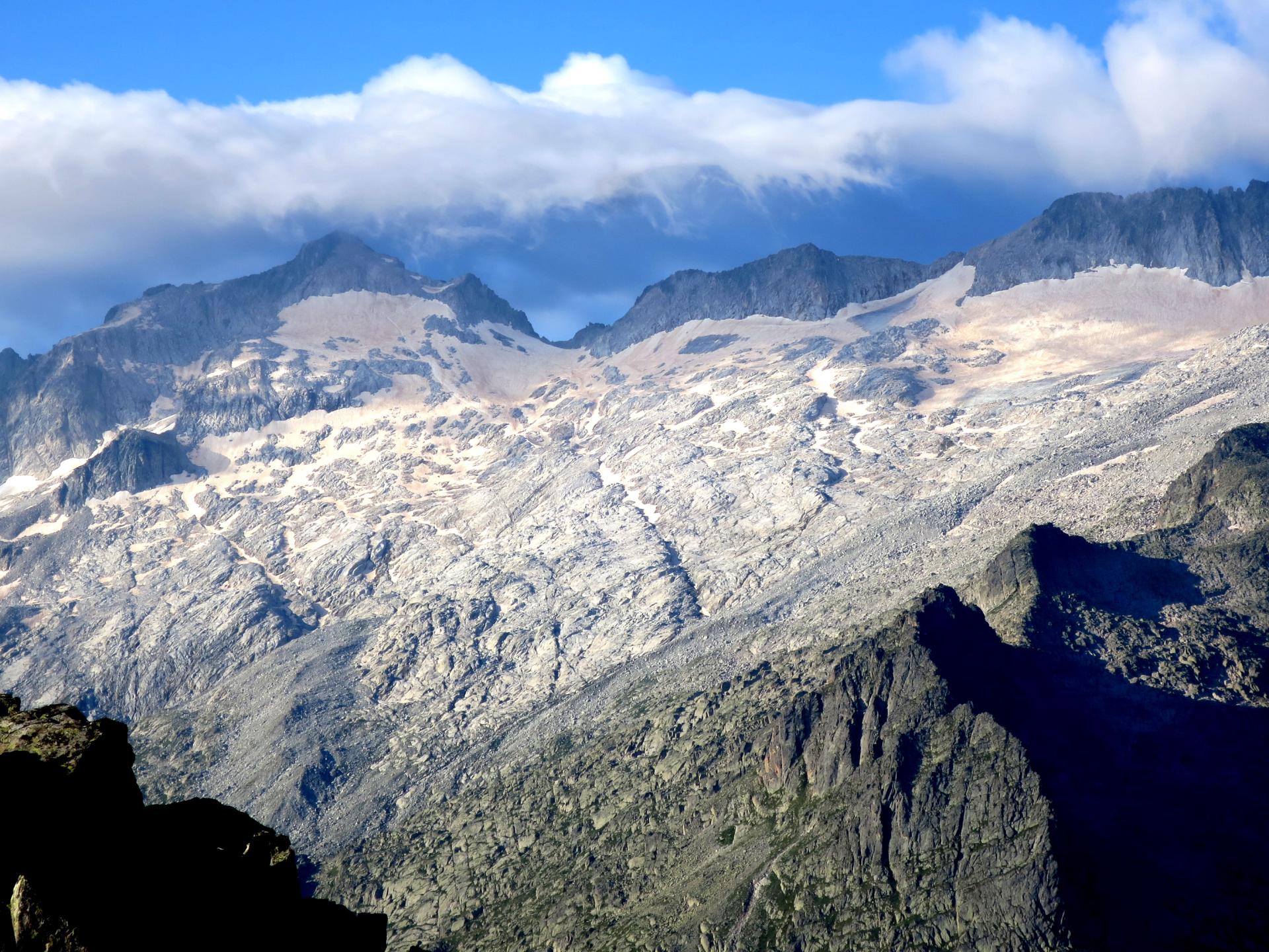 On évolue sur un océan de pierre figé pour l'éternité. Vers 2750m, on incline doucement vers la G en suivant la ligne de cairns et en visant le large col qui s'inscrit entre le Tuc de Molières à droite et le Cap deth Horo à gauche. On remonte le fil d'une moraine de blocs de granit au milieu de deux vallons autrefois glaciaires. Vers 2850m, apparaissent à main droite les picos de Aneto et de la Maladeta alors qu'à l'horizon lointain on note encore la présence des sommets qui dominent les Fonts de Remune.