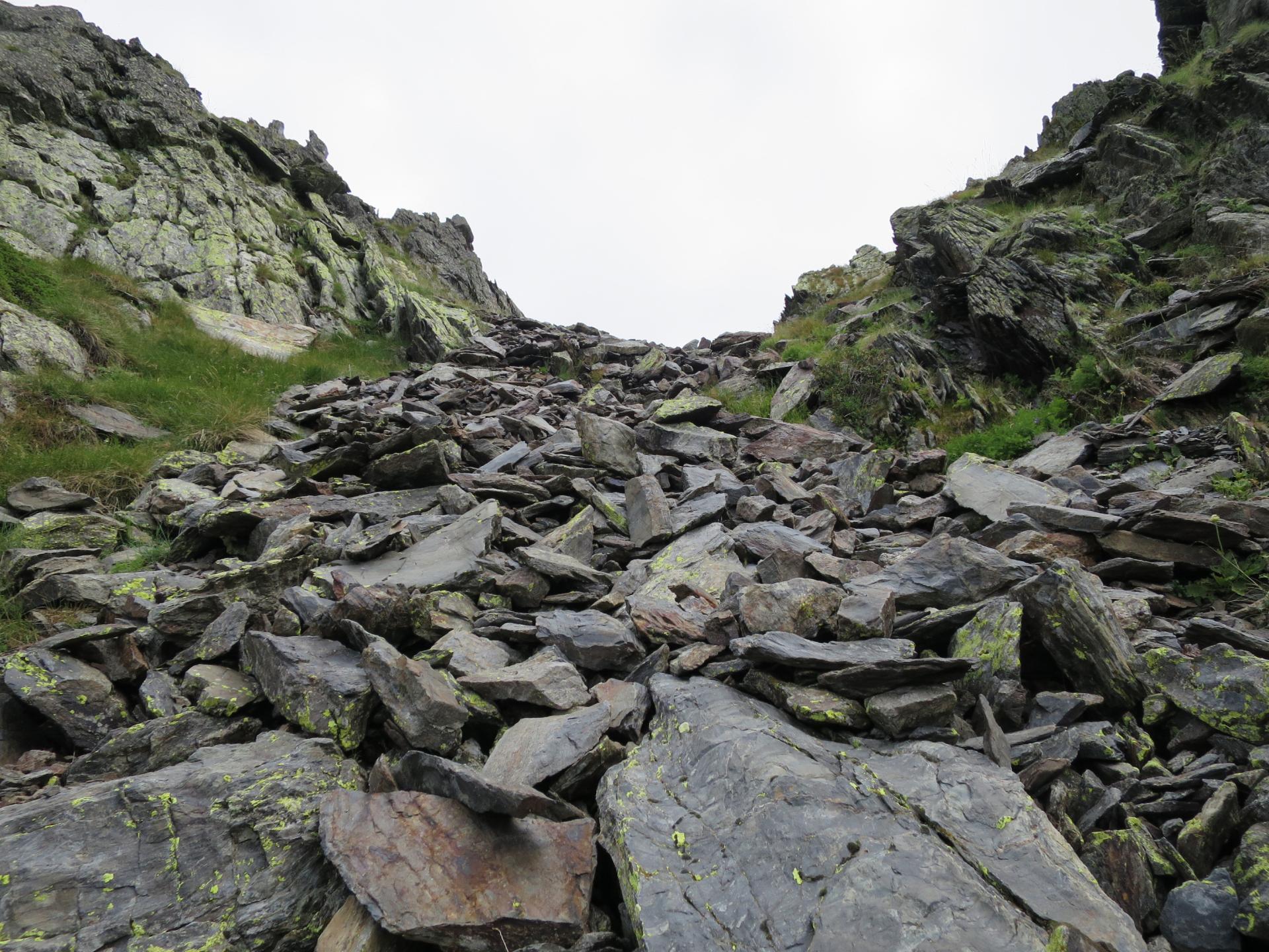 Derrière, on trouve une large vallée lacustre quasi plane que descend tranquillement le Riu de Guilo. Bien avant d'atteindre le lac supérieur, le balisage blanc-rouge invite à incliner vers la D pour s'élever sur une banquette herbeuse que l'on remonte quasiment vers le S (40mn, 2100m) avant d'obliquer vers l'E dans une directissime tracée dans un éboulis de très gros rochers. La progression est usante et ce n'est seulement qu'à partir de 2300m que l'on retrouve un "chemin" tracé au sol dans les pentes d'herbe. Et une pente un tantinet moins relevée. Quoique...
