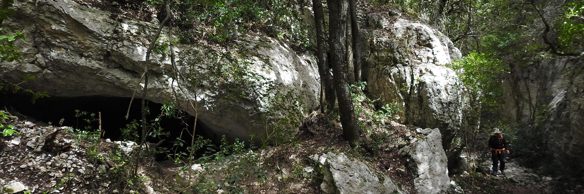 Au croisement de sentiers (670m, poteau indicateur "Coteau de Regagnade") on prend à G pour s'insérer dans la combe de Lioux (balisage jaune). On suit une large piste herbeuse qui descend tranquillement au fond du vallon jusqu'au croisement de sentiers du lieu-dit "Les Rouvières" (30mn, 536m, poteau indicateur, possibilité en montant à main droite de rejoindre prématurément le gîte d'étape en 1h20). On suit à présent le balisage jaune-rouge du GR de Pays de la Pierre en Vaucluse. On constate que la gorge se resserre au moment où l'on dépasse le rocher sur lequel le château ruiné du Castellas est érigé. Puis on passe devant une profonde grotte (10mn, 490m, abri possible) puis une seconde 200m plus loin. Après, c'est assez étroit et modérément chaotique jusqu'à la sortie de la gorge à l'approche des maisons du lotissement de Lioux (55mn, 300m). On monte sur la G pour contourner les propriétés et descendre sur le goudron rejoindre la RD60a (5mn, 295m, tables de pique-nique en face de la falaise de la Madeleine). On suit le balisage jaune-rouge vers la D jusqu'au carrefour routier où l'on incline à D en direction du hameau du Château. Un peu plus loin, négliger l'invitation à tourner à droite (balise flèche jaune) mais poursuivre sur la route principale en direction de l'W (nouvelle balise jaune). Après 250m, on traverse la route Parrotier - Bezaure pour suivre en face une piste caillouteuse en descente au SW. Au pied d'un imposant pin maritime juste avant de traverser le vallon (30mn, 281m), on trouve à main D le départ d'un sentier bien marqué au sol qui serpente dans le maquis ras de bruyères et de serpolet qui colonise le plateau calcaire en RG de la combe de Vaumale. On le suit toujours jusqu'au moment où il pénètre dans une pinède. Un sentier bien identifiable et débroussaillé démarre à main G (15mn, 345m) et permet de rejoindre par quelques zigzags le fond de la combe de Vaumale (quelques traces d'un ancien balisage bleu pâle).